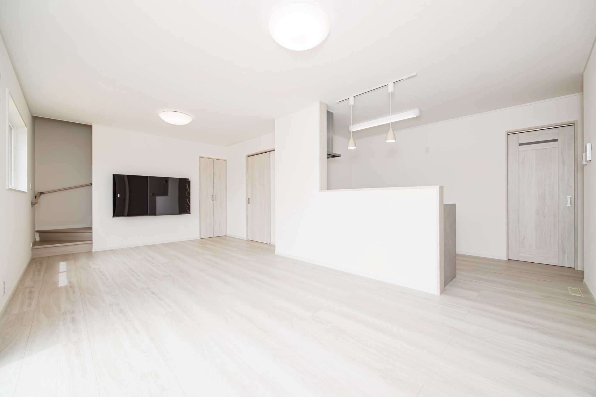 • 明るく清潔感のある内装: 白を基調とした明るく開放的な室内に、色付きのドアやクロスをアクセントとして配置。部屋ごとに好みのデザインを際立たせられる内装です。